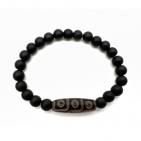 Bracelet élastique perles onyx mate 8mm et perle agate naturelle de style tibétain.